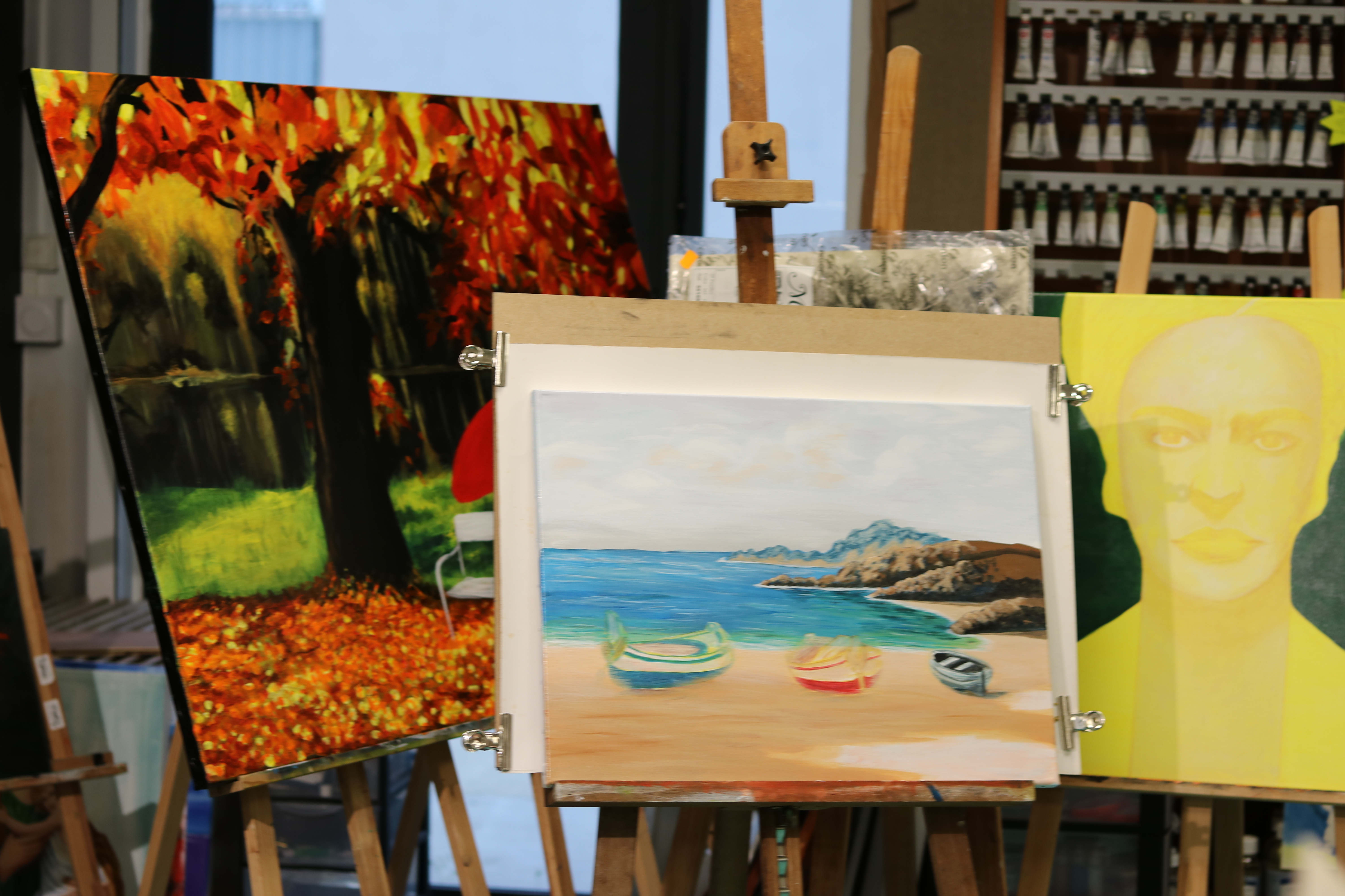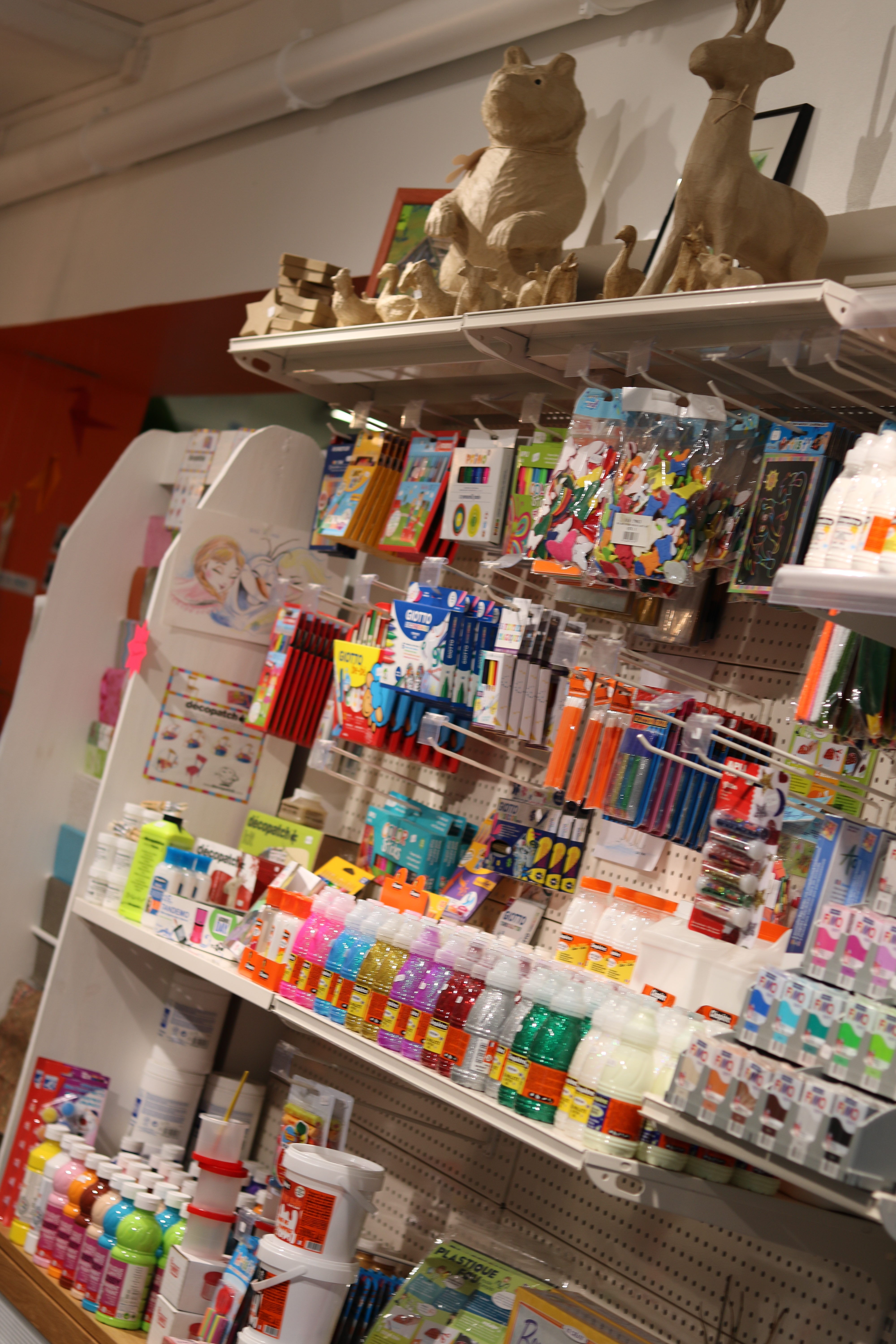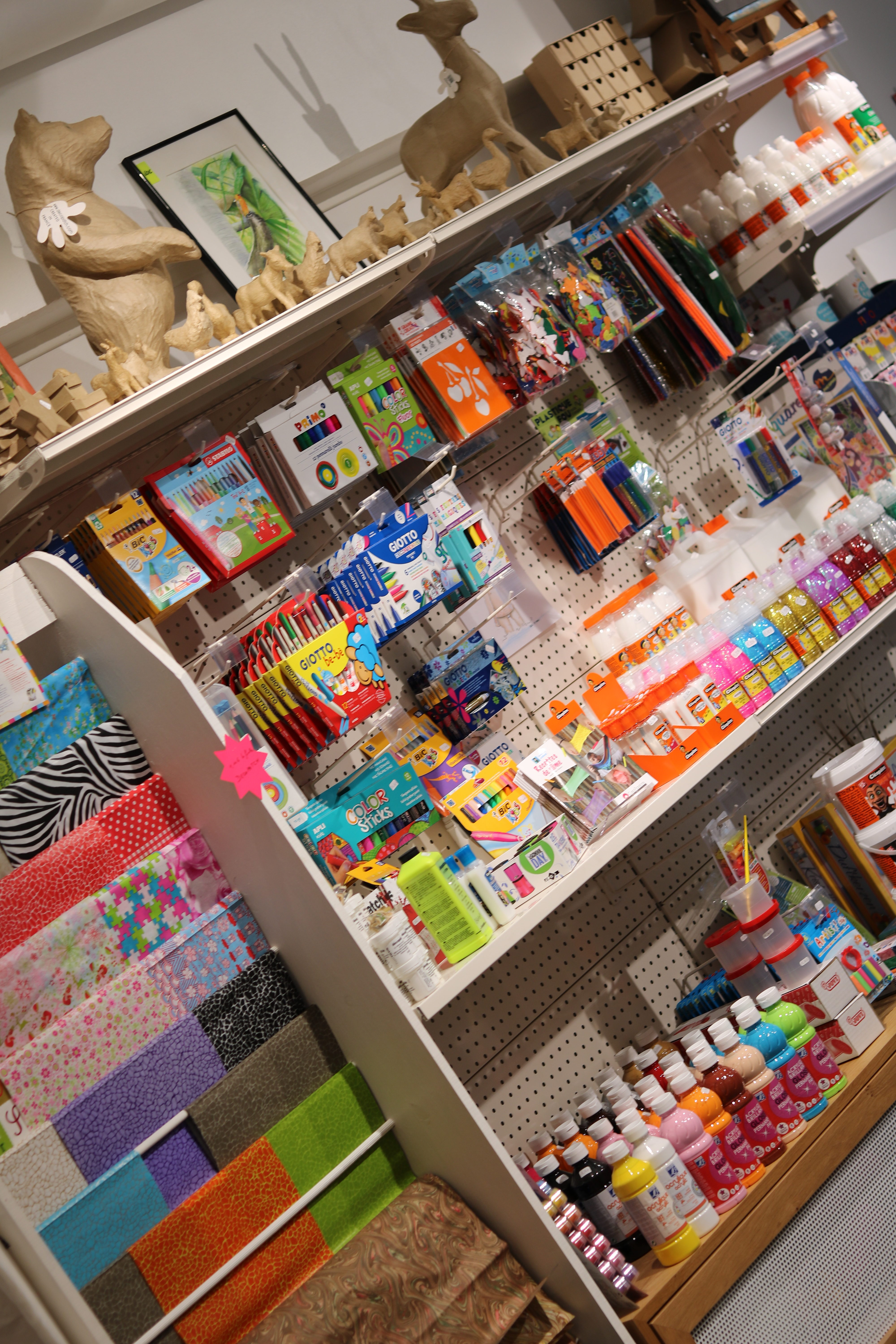 Dès l’entrée, un bel espace très lumineux nous attend. Tout d’abord une partie boutique, où les artistes en herbe et confirmés trouveront leur bonheur. Tous les types d’art y sont présentés : mosaïque, peinture, collage, dessin, sculpture, création, scrapbooking, carte à gratter,.. vous permettront de mettre votre esprit créatif au travail.