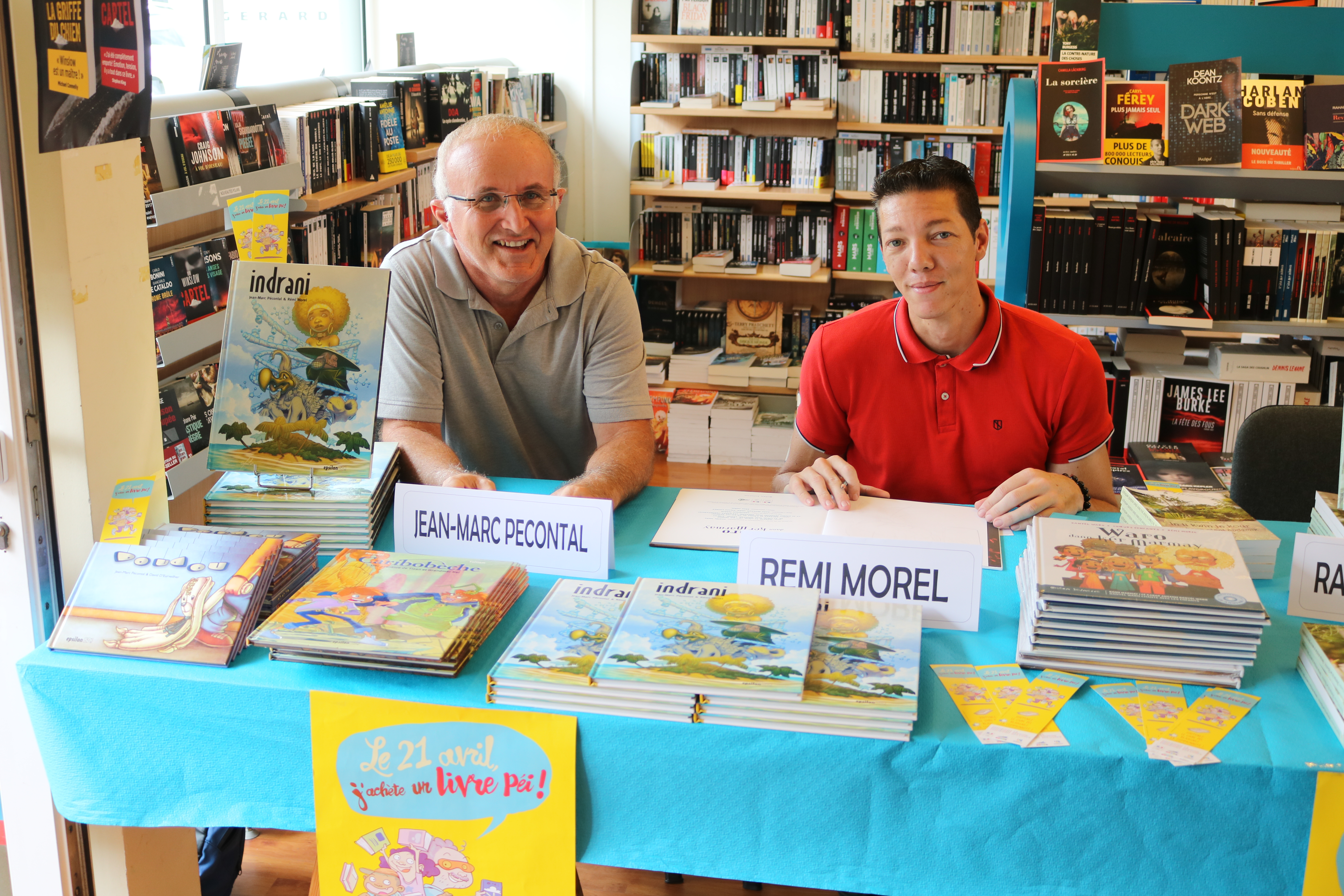J’ai également pu revoir Rémi Morel, dessinateur, toujours le crayon à la main, avec les livres « Waro dann ker marmay » et « Indrani » . Il présentait ce dernier livre avec Jean-Marc Pécontal, également auteur de « Doudou » et « Caribobeche », avec une Grandmèr Kal haute en couleur et dont le numéro 2 devrait paraître prochainement.