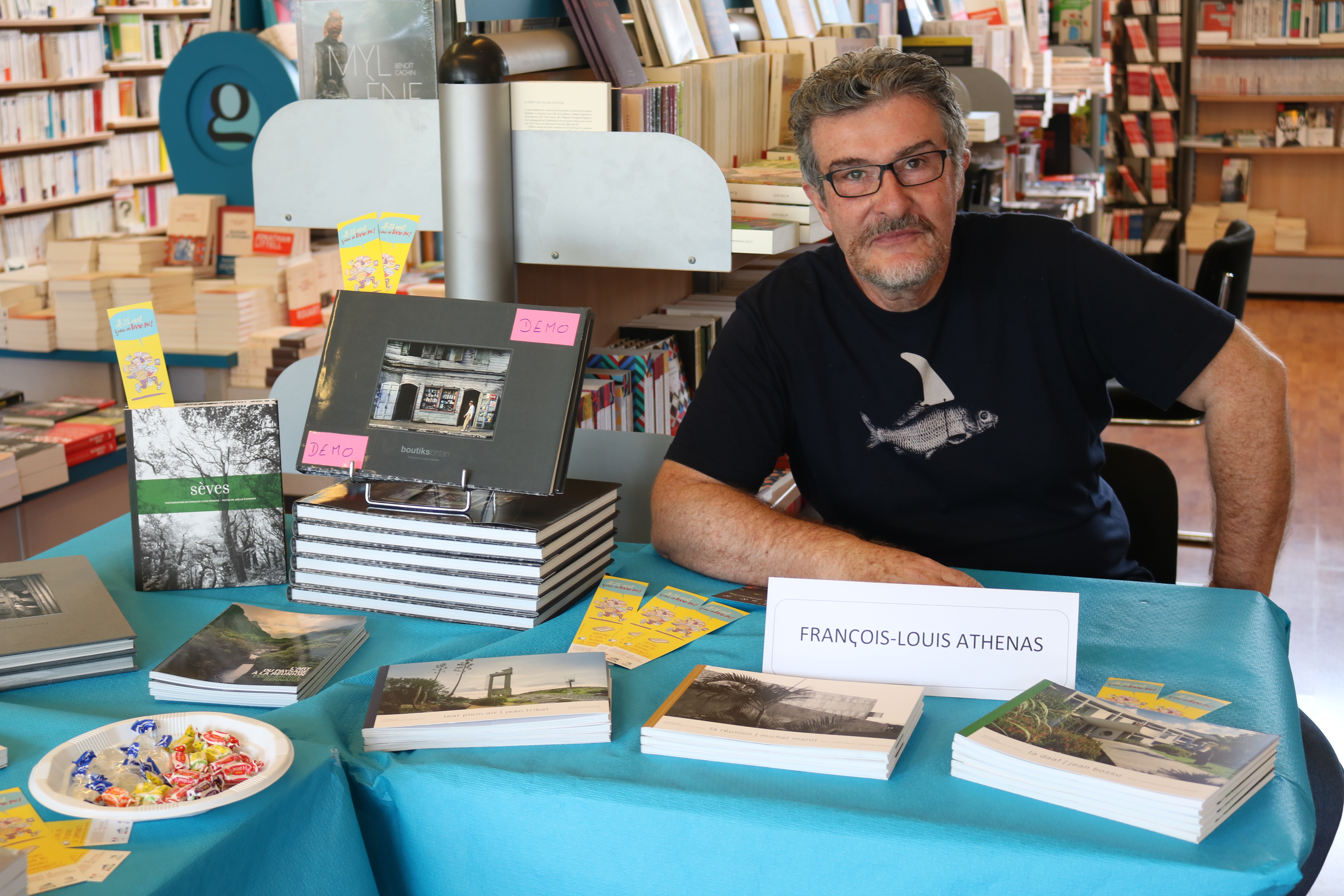 Les P’tits Monstres déposés à leur atelier, me voici à commencer mon tour des librairies, tout d’abord par la Librairie Papeterie Gérard, où vous pouviez rencontrer plusieurs auteurs, dans deux espaces différents, les équipes parées de leurs badges « J’achète un livre péi » vous accueillaient avec sourire. Du côté librairie, j’ai pu faire la connaissance de François-Louis Athénas, photographe et président de l’association Ter’la Édition. Cette association publie des livres en rapport avec l’art, la culture et le patrimoine de la Réunion, que vous pourrez retrouver dans leur Galerie « Ter’la » dans le bas de la Rivière. Un endroit qu’il me plaira de visiter prochainement.