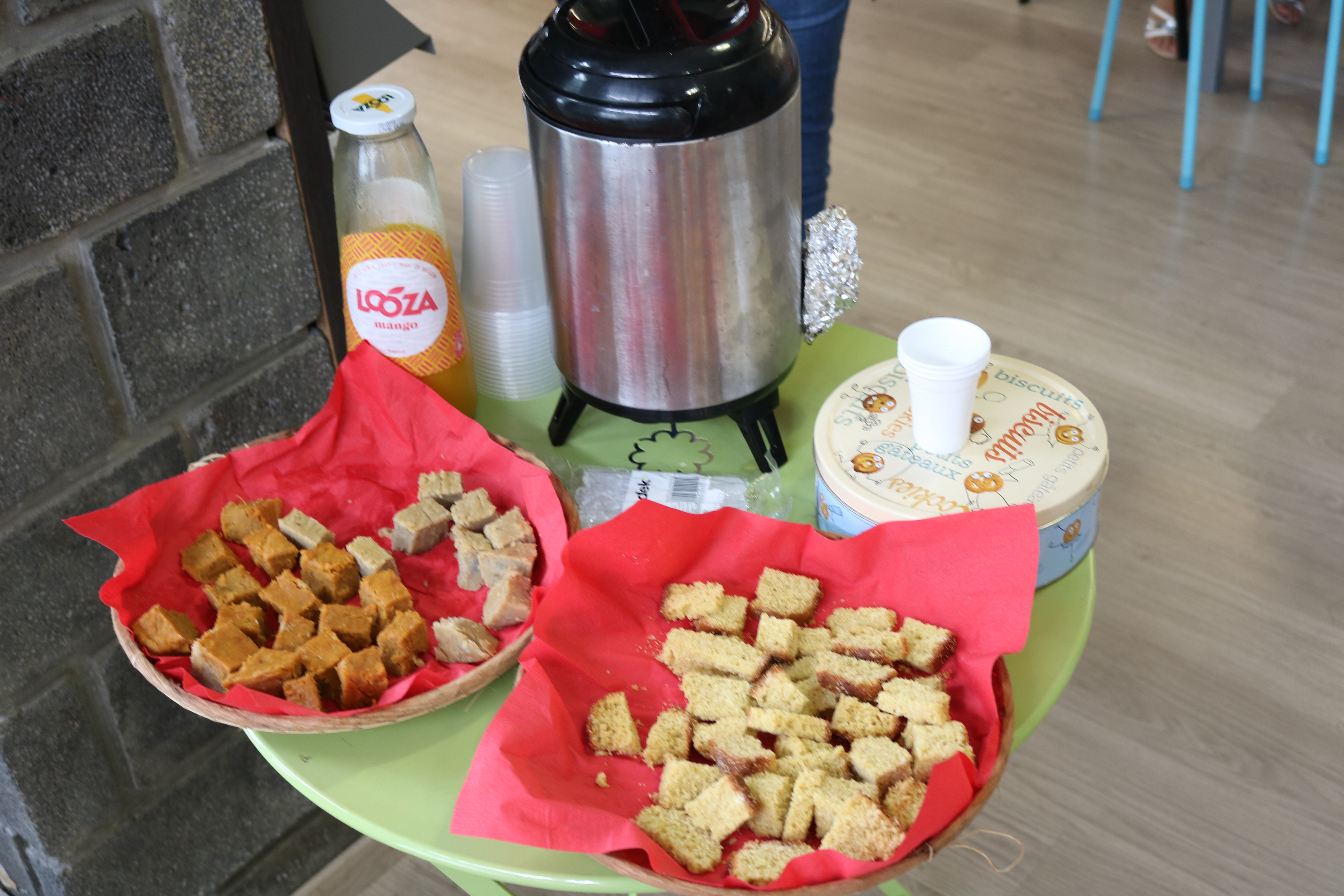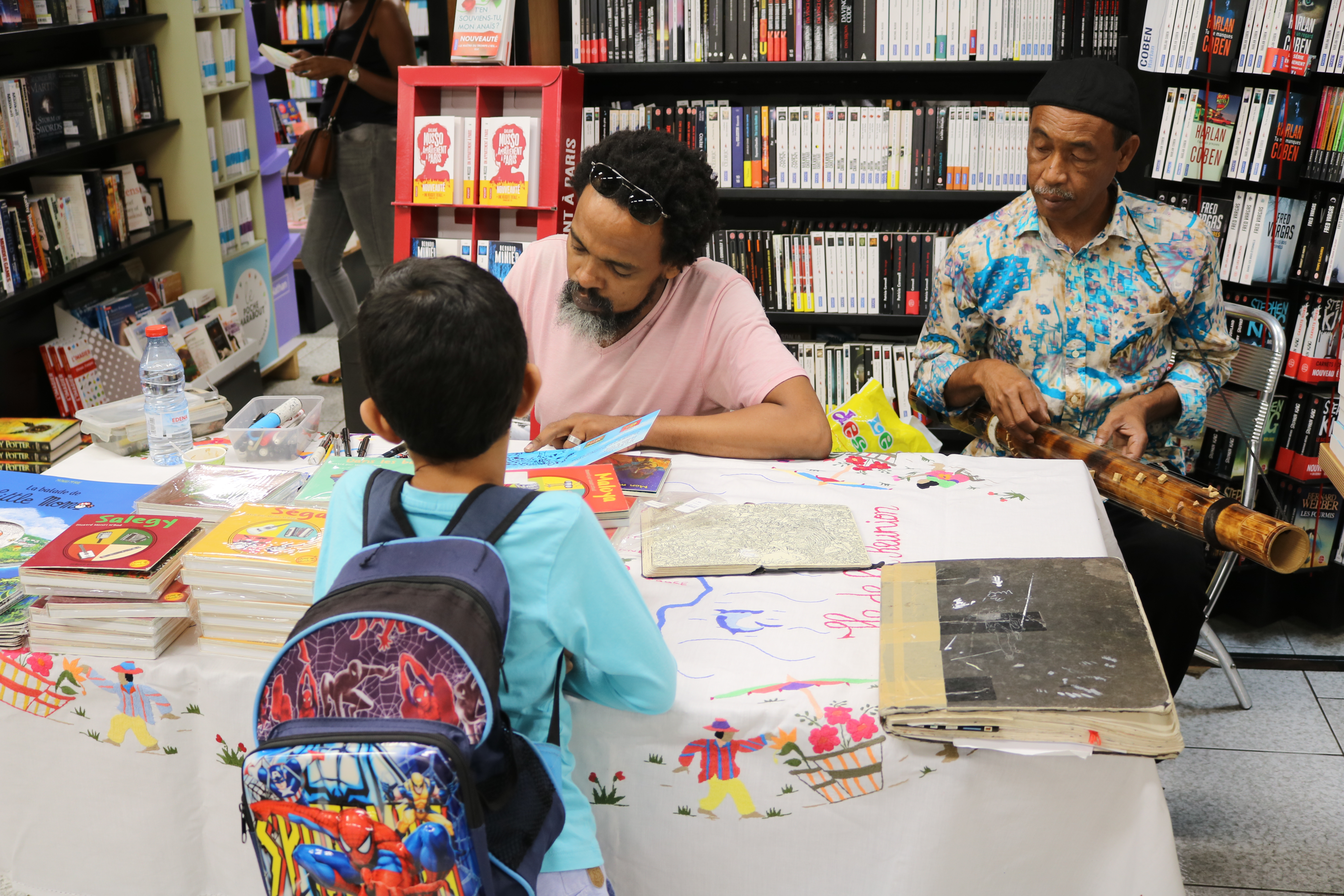 Samedi, en matinée, nous avons commencé notre tournée des librairies de Saint-Denis, par France Loisirs Réunion, où les enfants avaient un atelier coloriage/découpage/pliage avec Julie Legrand, auteure de «Alice au pays des virgules ». Certaines dédicaces avaient déjà commencé. Les décorations sur le thème créole sont mises en avant et un atelier dégustation proposait des jus frais, ainsi que le livre « Ti baba et le repas gourmand ».