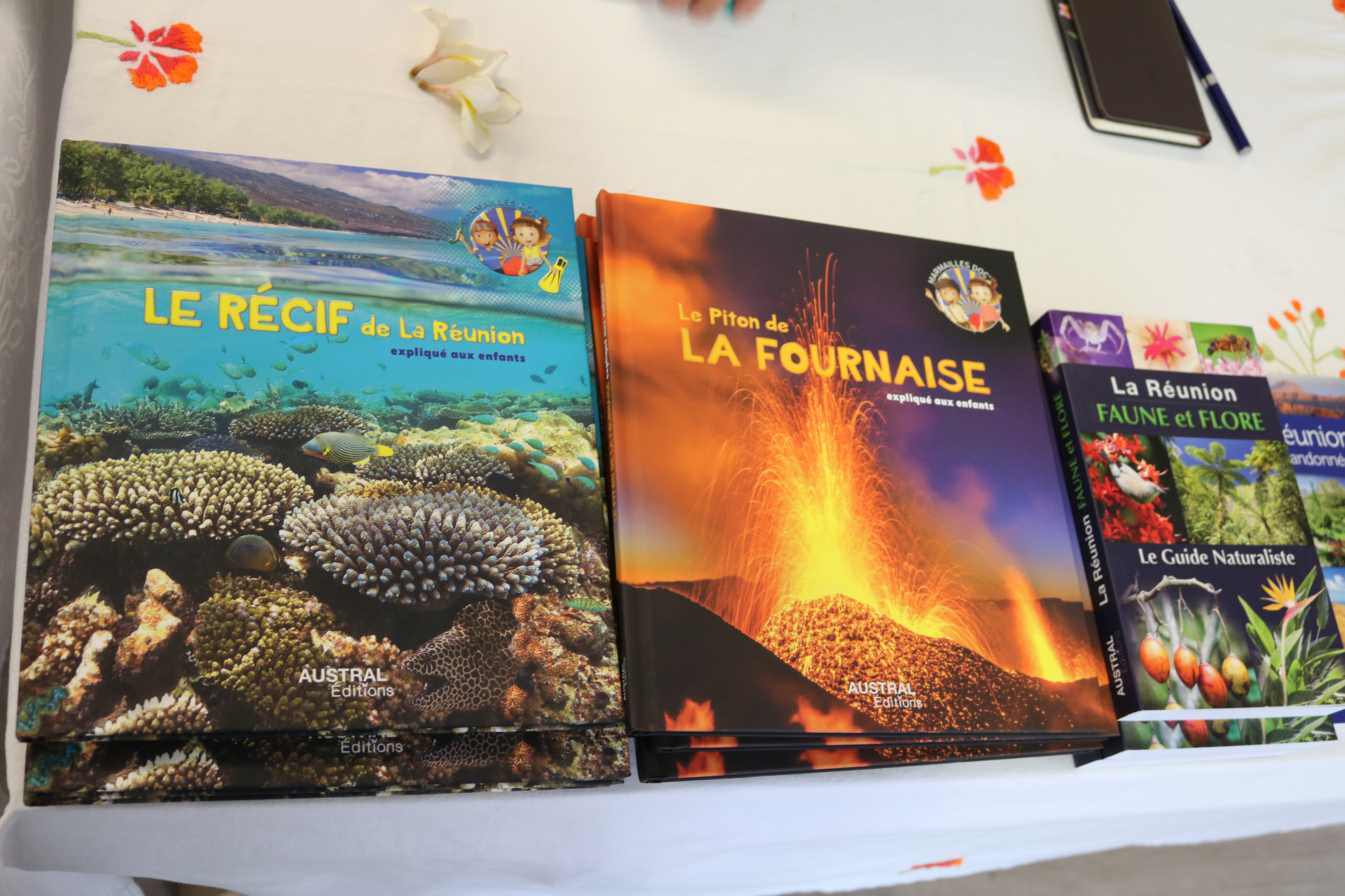 Julie Legrand, avec ses livres jeunesse et coloriage, ainsi que Stéphanie et Maëla pour Austral Édition, dont les documentaires enfants « Le Piton de la Fournaise » (que les enfants avaient déjà) et « Le Récif de la Réunion », des albums illustrés très intéressants. Une suite de cette collection «Marmailles Doc», est prévue pour la fin d’année.